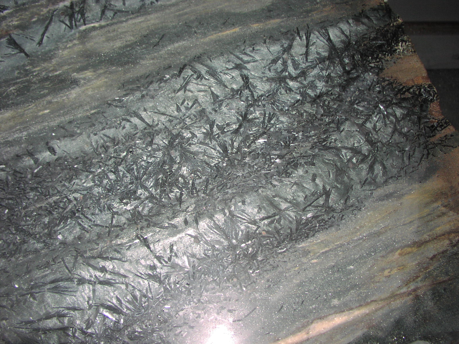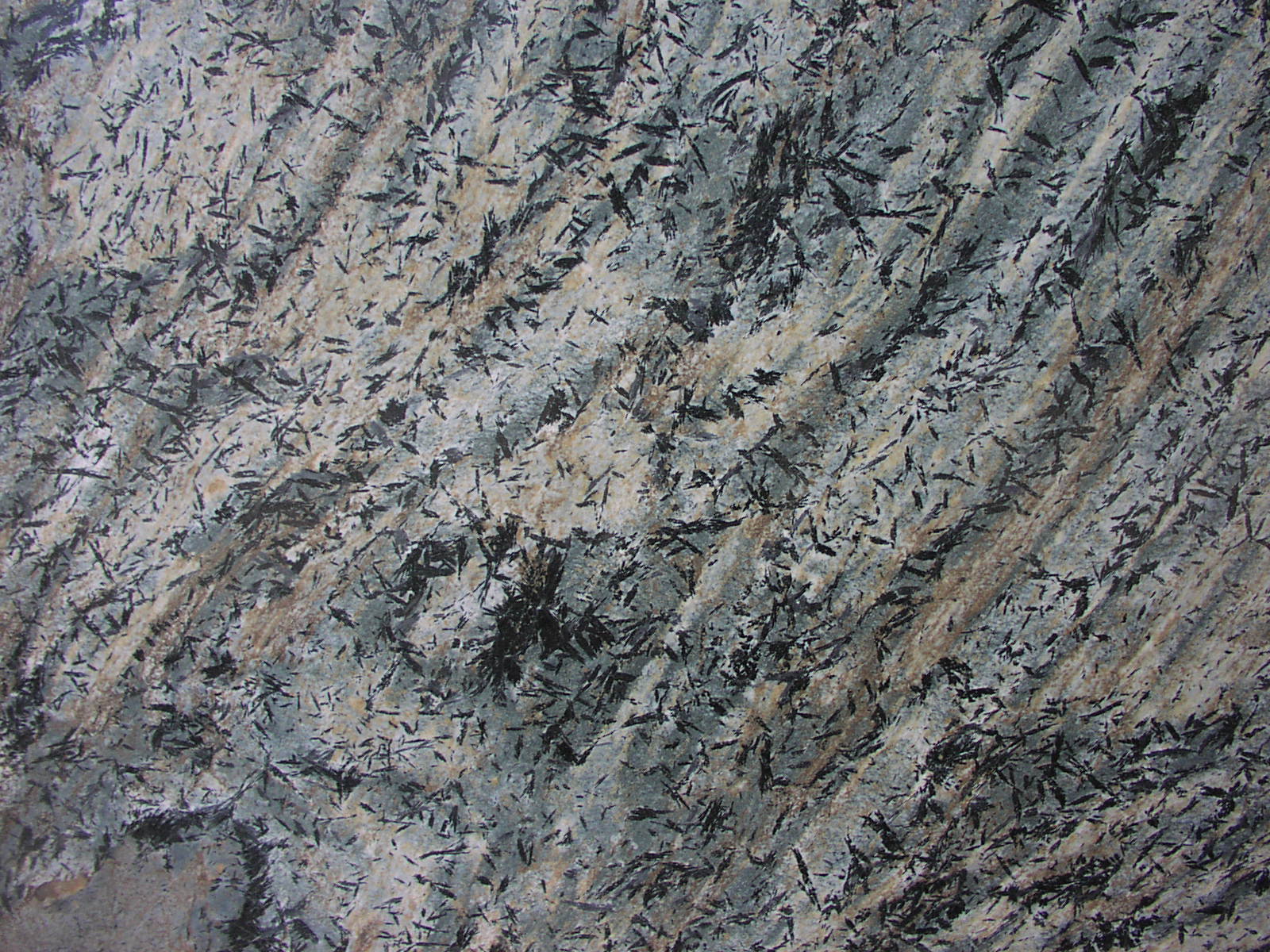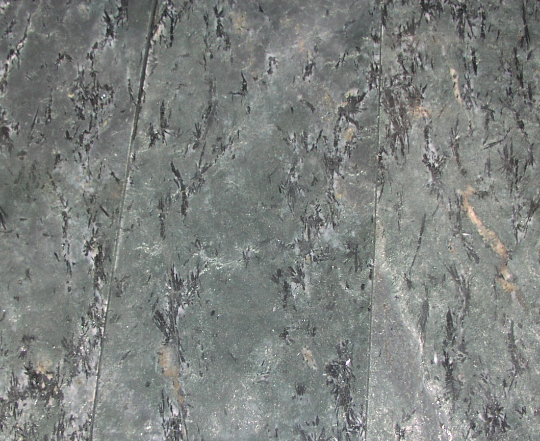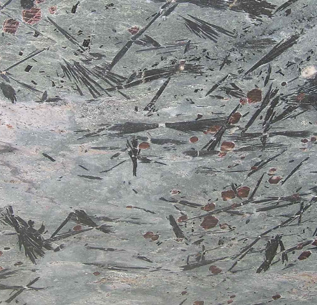 The other stone we quarry is Crowsfoot, a variegated schist that has been designated by the Marble Institute of America as one of this continent’s rare, exotic stones. This 600 million year old stone originally flowed out of ancient volcanos, cooled slowly, grew the wonderful crystal inclusions and than was pressed and folded in the crush of continents. It has a field of opalescent teal green or sea gray with varying sized bundles of black hornblende crystals (crowsfeet), feldspar, quartz ribbons and occasional cherry wood colored garnets. Every block we quarry is unique and therefore each variation is a limited edition. Each time we quarry a new variation we give it a name. To date, we have about 10 named variations of Crowsfoot. This stone is used for fine interior applications; kitchen countertops, vanities, floor tile and planking, fireplace surrounds and wall panels. Crowsfoot comes in a satin or an understated polished finish.